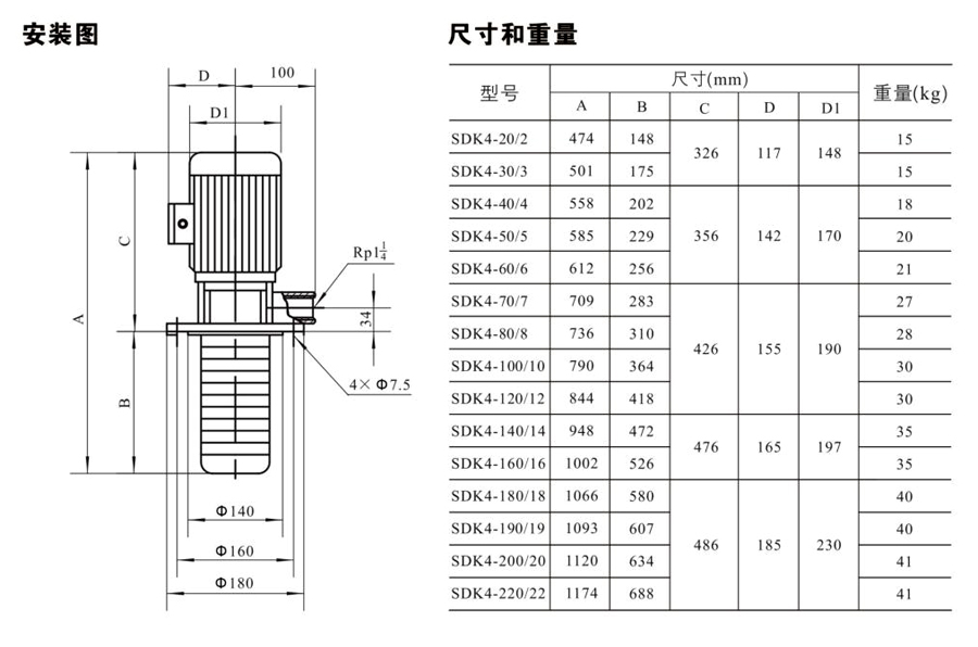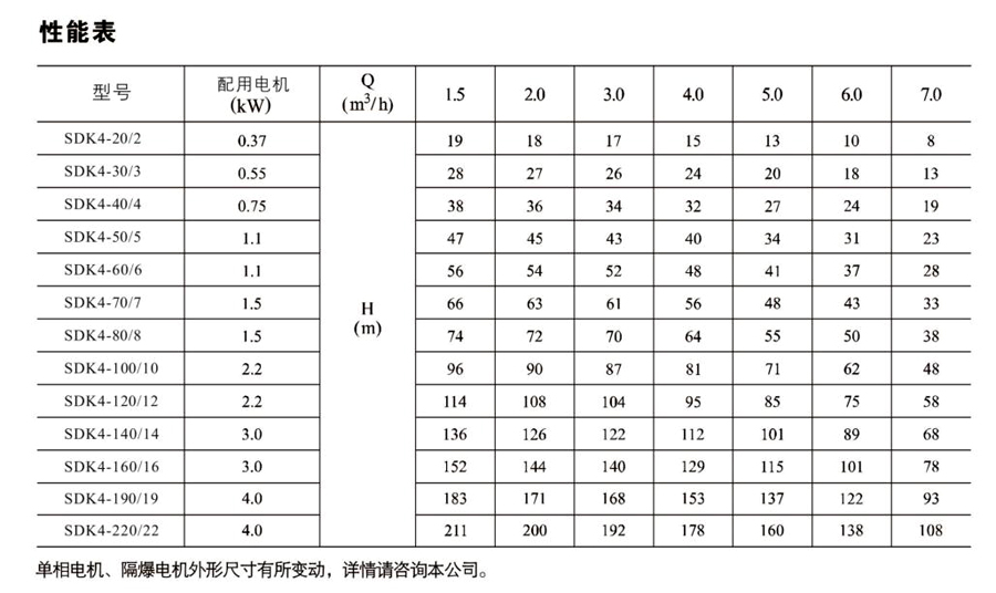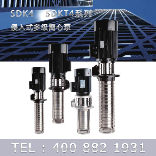 SDK4/SDKT4為配用標準電機的非自吸立式多級離心泵,電機軸和泵軸用聯軸器直接聯接的結構。為滿足水槽或容器的安裝深度,可安裝空套的腔體來改變泵本身的侵入 深度。
